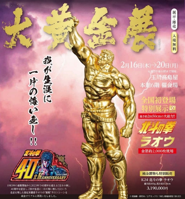 明日2月16日から20日までの5日間、玉川島屋の本館6階の催会場にて開催される「大黄金展」(主催:株式会社SGC)にて展示される模様。入場無料。