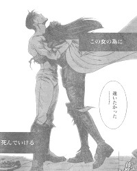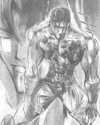 ケンシロウへの気持ちが薄れたジュウザは、再び自由気ままな生活へと戻っていた。だがそんなジュウザを動かさんと現れたのは、リハクからの使いの者達であった。南斗最後の将が選んだのは、拳王ではなくケンシロウ―――。ヒューイ、シュレンの二人が散った今、拳王の進軍を止められるのはジュウザ様をおいて他にない。そう言って助力を求めるリハクの部下達であったが、ジュウザは全く聞く耳を持たなかった。顔も知らぬ将のため、そして憎きケンシロウのため、ジュウザが動かねばならない道理は何もなかった。 ![]() 出陣の直前、ジュウザに声をかけてきたのは、リハクであった。ユリアを恋敵であるケンシロウと会わせる事……。それがジュウザにとってどれほど非情な指令か、リハクは理解していた。だが、今のジュウザには憎しみの気持ちなどなかった。 旅の中でジュウザは、様々な者達と出会い、その生き様を目にしてきた。彼等は皆、それぞれの目的に向かって懸命に生きる者達であった。だが当のジュウザには、生きる目的など何一つ無かった。ユリアが死んだあの日からずっと―――。しかしユリアが生きていたと知った今、遂にジュウザはその虚無から解放されたのだった。南斗五車星の一人として、その命をユリアのために捧げる事。それがジュウザが手にした"自らの生きる意味"であった。 かたや拳王軍の将として、かたや五車星の一人として。かつての幼馴染であったラオウとジュウザが、数年の時を経て、敵同士として相対する。陰りを見せぬジュウザの強さを目にしたラオウは、かつて己が感じた予感が正しかったことを確信した。己が天を掴むための最大の障壁となるは、このジュウザであるという事を。だがジュウザにとって、野望の成否は問題ではなかった。旅の中でジュウザが目にした、拳王に支配される者達……。恐怖に縛られた彼等の目には、絶望しか映っていなかった。誰もお前の作った世界を喜んでいる奴はいない―――。何人にも祝福されない、独りよがりの野望に捉われたラオウに、ジュウザは哀れみすら感じていたのだった。 黒王号を奪うことで、ラオウの足を止めるという作戦はひとまず成功に終わった。だがその戦いの中で、ジュウザは両者の間にある埋めがたい力量差を感じていた。やはりこの命、捨てねばならない―――。次にラオウと相見えた時が、己の死ぬ時であることを、ジュウザは悟っていた。 二日後、再びラオウと相見えたジュウザは、突如自らの鎧を砕き割った。生か死か。自ら後退の道を絶った背水の拳で、勝負をかけるジュウザ。だがその捨て身の拳をもってしても、ラオウに致命傷を与える事はできなかった。寸前に突かれた秘孔 鏡明により、既にジュウザの両腕は崩れさっていたのである。勝利を確信し、止めの一撃を叩き込まんと歩み寄るラオウ。ここまでか―――。そう思ったとき、ジュウザの中に、かつてのユリアの言葉が響いた。 「雲を見ていると、『どこまでも行けるんだな』って、自由な気持ちになれる!」 自由なのは雲だけではない。それを見ている全てのものを自由な気持ちにさせる。それが雲の役割―――。己が愛する女に、真の"自由"を与えるまで、まだジュウザは死ぬわけには行かなかった。 両手を広げ無防備に立ち尽くすジュウザに、渾身の一撃を叩き込むラオウ。だが次の瞬間、ジュウザはそのラオウの右腕にしがみ付き、体を引き倒した。飛びそうな意識の中、最後の力でラオウの片腕を折らんとするジュウザ。だが、ラオウの力はジュウザの予想を遥かに超えていた。右手一本で軽々と持ち上げられたジュウザに、ラオウの指が突き刺さる。それは、自らの意思とは関係なく口を割るという秘孔、解唖門天聴であった。将の正体は誰か!そのラオウの問いかけに、ゆっくりとジュウザの口が開かれる。 「け 拳王の ク・ソ・バ・カ・ヤ・ロ・ウ」 ![]() その昔―――、夕暮れの草原を走る幼い男女の姿があった。恋人同士か、兄妹か。ただ少年は、ただひとつ心に決めていた。何があってもこの少女を一生守り抜いてみせると。ずっと一緒にいてね。その少女の言葉に笑顔を返し、少年はアオアズマヤドリの巣がある木へと急ぐのであった。 |