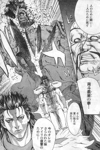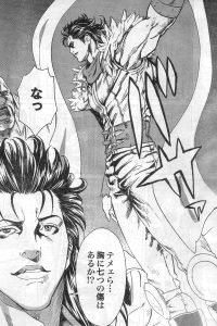 核の炎により文明が崩壊した世界。荒れ果てた世紀末の荒野には、復讐に燃える一匹の狼の姿があった。南斗水鳥拳のレイ。南斗六聖拳の中でも最も優雅華麗と呼ばれた拳の伝承者であるその男は、いまや復讐に生きる餓狼へと成り果てていた。両親を殺し、妹アイリをさらったという七つの傷の男―――。その男を見つけ出し殺すまで、レイはどんな事をしててでも生き延びねばならなかった。 荒野でレイが出会ったのは、サイという名の少年。彼は、妹マリを野盗に連れ去られたという、奇しくもレイと同じ不幸を背負った少年であった。自らの手でマリを取り返さんと、単身野盗たちのもとへ乗り込まんとするサイ。しかし、傷を負ったその身体では、それ以上歩を進めることは出来なかった。だが、こぼれ落ちた食糧をレイが拾おうとしたとき、サイはその腕目掛けて短剣を突き刺してきた。それは妹にあげるんだ―――。妹への想いだけで突き動かされるその少年に、レイは餓狼と化した己の姿を重ね合わせていた。数刻後―――。野盗達のアジトには、マントで身を隠した美女が訪れていた。だがそれは、アジトの中へと入り込むためのレイの変装であった。相手が南斗水鳥拳の使い手だと知り、降伏を申し入れてきたボスに対し、食糧と女達を全て差し出すよう要求するレイ。しかしその時、遅れてサイがアジトへと殴り込みをかけてきた。あっさりと取り押さえられたサイに、野盗達の凶器が振り上げられる。だがその危機を救ったのは、レイであった。七つの傷が無ければお前たちに用はない―――。動揺する野盗達を、次々とレイの水鳥拳が切り裂いてゆく。もはや戦いは避けられぬとして、泰山流棒術奥義 載天鳳にて挑まんとするボスであったが、その実力差はあまりにも大きかった。 レイがボスの真上を飛び越えた瞬間、その身体は、細やかな肉片へと変えられていたのだった。それはまさに、南斗義星の拳といわれる、美しき南斗水鳥拳の舞であった。幼い兄妹から礼を述べられ、その顔に一瞬綻びを見せるレイ。そして、兄が守り抜いたチョコレートを分け合う二人の顔には、これ以上無い笑顔が溢れていた。この兄妹のような笑顔を、アイリにも必ず取り戻してみせる―――。そのためならば、泥をすすってでも生き延びてみせることを、レイは改めて純白のケープに誓うのだった。 |