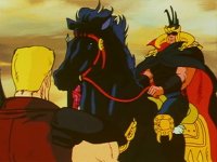 アインが開いたその中から現れたのは、致命傷を負ったケンの恩人、ショウキであった。ケンとショウキ2度目の再会は、皮肉にも今生の別れとなったのである。すべての元凶であるジャコウ討伐をケンに託し、力尽きるショウキ。彼を死に至らしめたその青の槍の持ち主は、青光の将軍、ボルツのものであった。| [漫画版との違い] ・中央帝都を前に意気込む北斗の軍の元へ、リハクがジープにのって駆けつけるシーン追加。 ・原作におけるシーノがボルツに、ジャスクがタイガに変更。以後も概ねジャスク、シーノの行動はこの二人が担当。 ・ファルコが呼び出される直前に、ショウキも呼び出され、ケンシロウを見逃した罪としてジャコウに折檻をうけたというエピソードが追加。 ・ファルコがジャコウに呼び出された際、ジャコウの横にミュウがいる。 ・ファルコと拳王が対峙した村が、天帝の村から元斗の村に名前が変更。 ・この村の財産を全てやるから俺は助けてくれ、とジャコウがラオウに懇願する台詞が追加 ・ショウキを殺すとき、原作ではシーノ一人来て水中から貫いたが、アニメではジャコウ、タイガ、ボルツの三人で訪れ、水路の脇道から、ボルツが槍を投げた。 ・息のあるショウキを発見したのが、北斗の軍の一員から、アインに変更。 ・原作のショウキは、皮肉な運命だと言い残して死ぬが、アニメでは悪の元凶ジャコウを倒すよう依頼するに変更。 ・槍の持ち主を特定したのがバットからリハクに変更。 ・原作では燃やした旗をシーノがその手に持っていたが、アニメでは柱に旗を掲げ、ボルツの放った闘気で燃やすに変更。 ・原作ではケンの投げた槍でシーノが死亡したが、アニメではボルツの襟をかんで背後に貼り付けにしただけで、死なず。 |